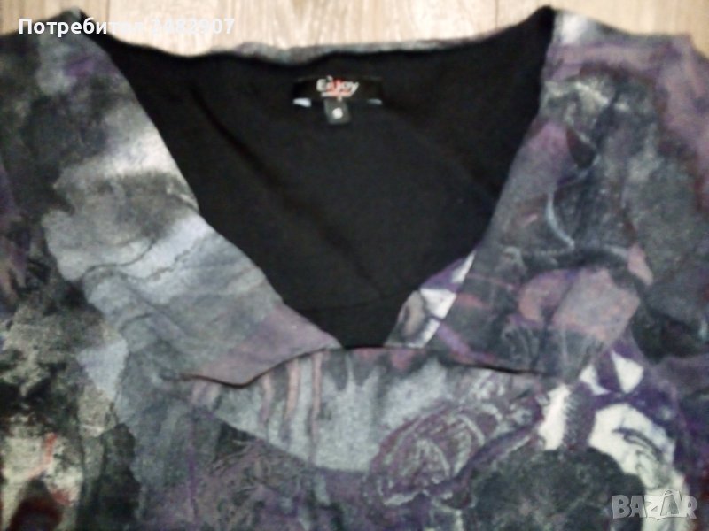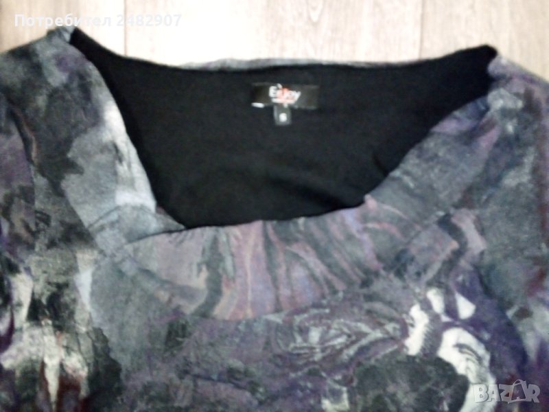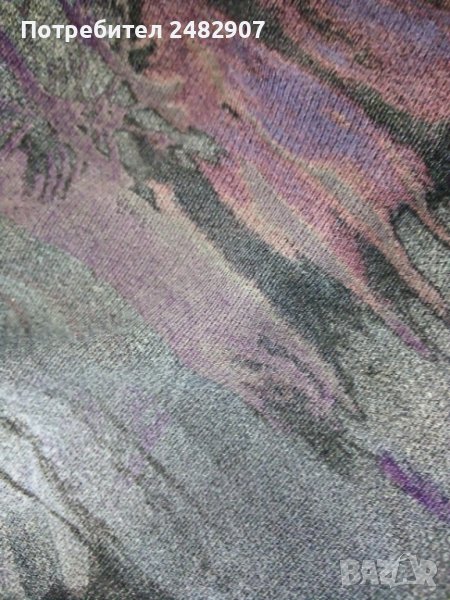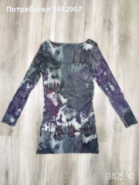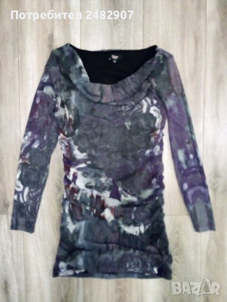 Дамска туника - тюл, размер S. Съдържа 100 % полиестер. Ширина в раменете - 38 см, ширина под мишниците - 40 см, ширина в долната част - 49 см, дължина от рамото до долу - 76 см, дължина на ръкава от рамото - 58 см, ширина на ръкава в долната част - 10 см. Много запазена, използвана е веднъж за повод, с подплата в областта на тялото (ръкавите са без подплата, полупрозрачни), с ефектно деколте и набръчкан ефект, без забележки.