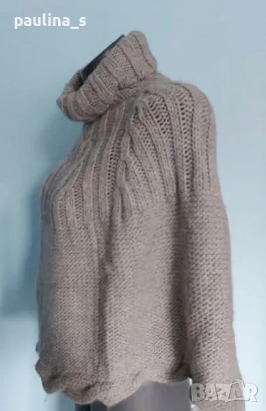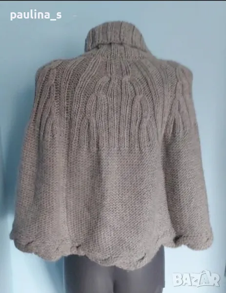 Много топло и пухкаво дизайнерско пончо, ръчна изработка. Съставът е вълна и алпака(косъм от лама, много мек, като коприна) с примеси. Моделът е много специален, ръчните плетеници са прецизни и красиви. Снимките са на верев, за да се види изработката, ново без дефекти, само ефекти. Дрехата е за ценителки на ръчната изработка! Дължина 69см