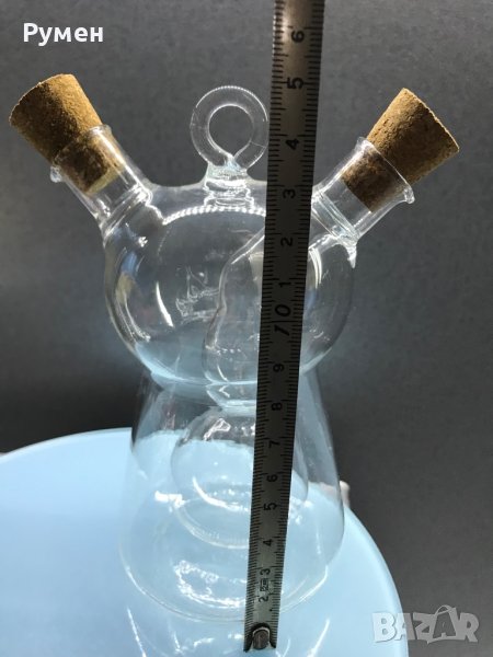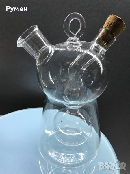Стъклен оливерник 2в1, за оцет и зехтин. Вместимост 350 мл., неизползван, висококачествено стъкло и корк,