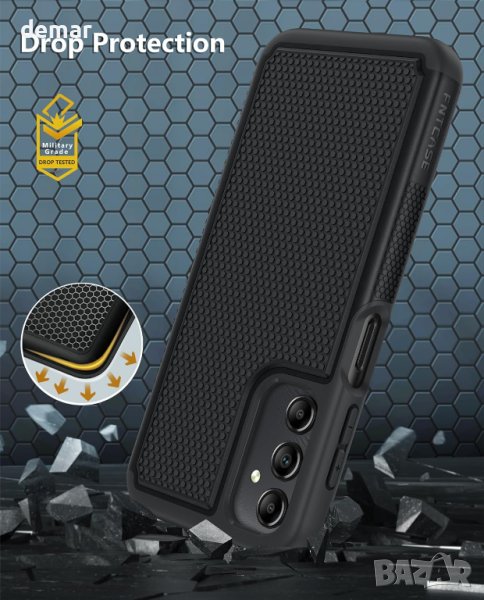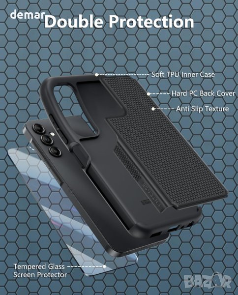 Калъф за Samsung Galaxy A15 4G/5G/LTE (6,4 инча) с премиум HD протектор от закалено стъкло за допълнителна защита. Този издръжлив хибриден калъф включва здрав твърд външен капак от РС и мек вътрешен калъф от TPU, за да устои на удар и да абсорбира удара, осигурявайки 360-градусова защита на цялото тяло на вашия телефон. С дизайн против хлъзгане и релефен модел на пчелна пита, абсорбиращ потта, той предотвратява случайни изпускания, докато повдигнатият с 2 mm панел на екрана и ръба на камерата предпазва от драскотини, петна и прах, като гарантира, че телефонът ви остава чист и безопасен по всяко време.