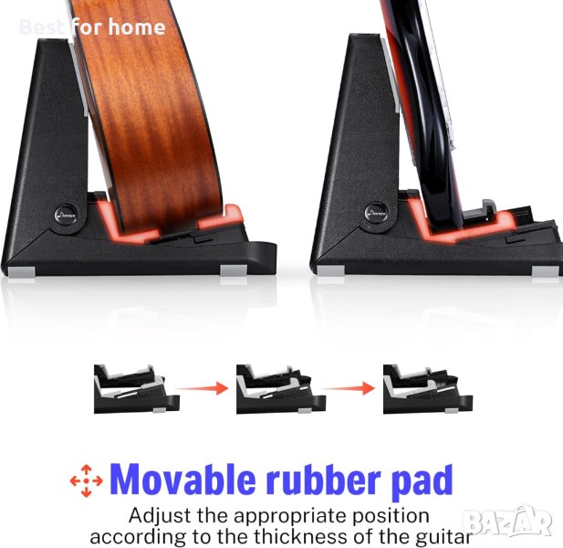 Стабилна и регулируема: Китарата може да се държи стабилно с дизайна на канала, когато стойката е разгъната. Четири гумени капачки на крачетата са против плъзгане за допълнителна стабилност. С подвижен плъзгащ жлеб можете да регулирате правилната позиция за фиксиране на инструмента според дебелината му.