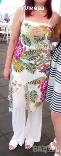 Гащеризонът има свалящи се презрамки, които могат да се коригират. Закопчава се със страничен цип. Размер L.От мишница до мишница е 40 см, като се разпъне ластика достига до 50 см. За висока жена е над 170 см. От мишницата до подгъва на крачола е 130 см.
