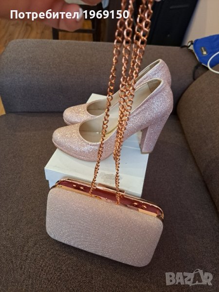 Дамски обувки нови цвят пудра ситен брокат и чанта клъч ситен брокат без забележки обувани са веднъж за няколко часа номер 38.Чантата има и къса дръжка която се вижда на снимката,късата дръжка може да се свали по ваше желание. Изпращам с опция преглед и тест.