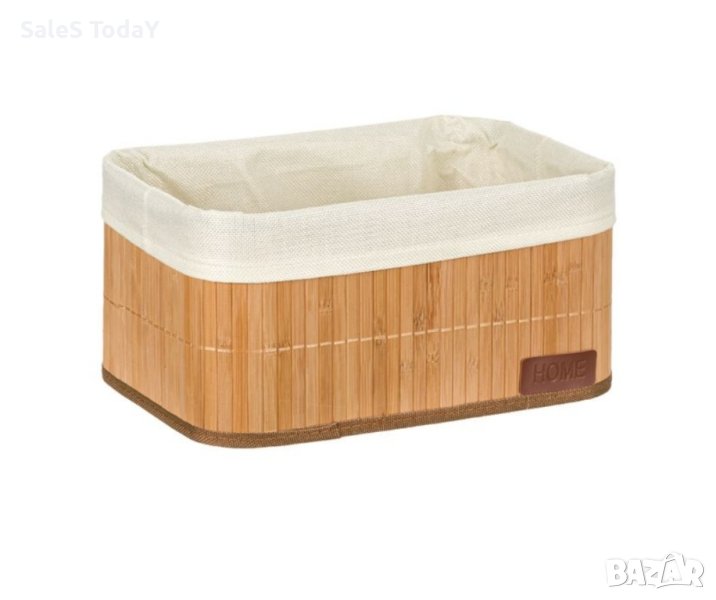 Бамбукова кошница за съхранение Beige Fabric Home 32x22x16cmКод 1202666кошница за съхранение от бамбуково дърво в естествен цвят и вътрешна подплата от бежов плат, идеална за дребни вещи в банята. материал на кошницата: 80% бамбук - 20% полиестер. Материал на подплатата: 100% полиестер. Дължина x ширина x височина 32x22x16 см