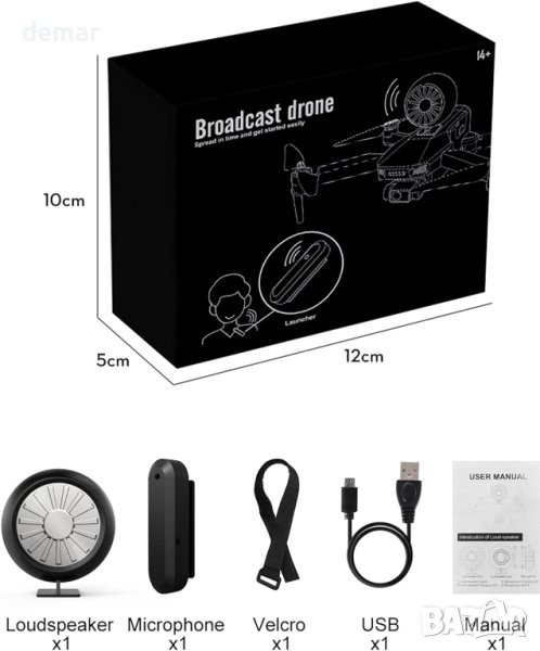 Универсална система, подходяща за всички модели дронове и RC автомобили, включително популярни марки като серия DJI Mini, серия Mavic, серия Phantom и др. Изработен от издръжлив ABS материал, този лек високоговорител (с тегло приблизително 49 грама) разполага с велкро основа, за да се осигури лесно закрепване, без да се прави компромис с издръжливостта на дрона. Работейки в честотната лента 400-480MHz, той осигурява ясен, мощен звук с до 100 децибела усилване, улеснен от вграден чип за декодиране на глас. Оборудван с литиева батерия с голям капацитет, високоговорителят предлага около 3 часа непрекъсната употреба с едно зареждане, докато микрофонът, захранван от отделна батерия, осигурява удобна комуникация, без да пречи на управлението на дрона. В пакета са включени високоговорител, микрофон, USB кабел за зареждане, велкро лепенка и ръководство с инструкции, осигуряващи всичко необходимо за подобрена комуникация с дрон и гъвкавост в различни настройки.