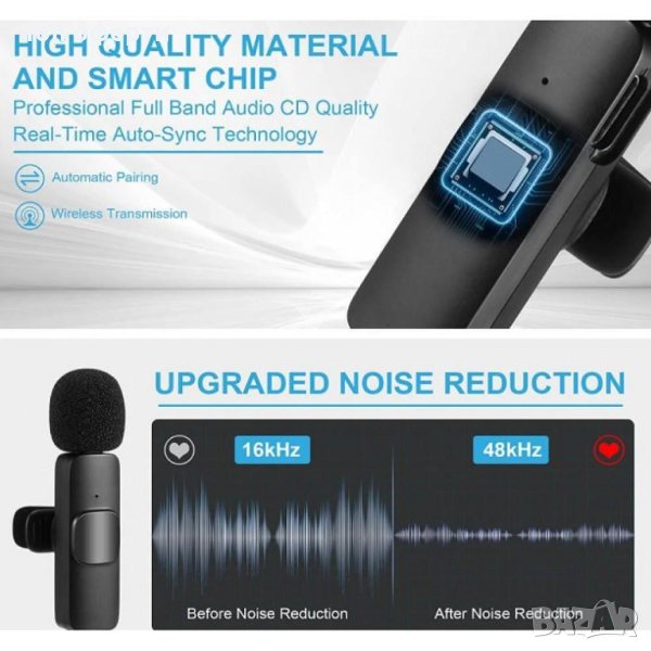 Вграден чипсет за външно намаляване на шума – K9 безжичен микрофон за Android смартфони с аудио жак тип c безжичен многопосочен микрофон безжичен петличен микрофон е вграден с професионално ниво на интелигентно намаляване на шума най-новата технология на чипсет, която дава ефективна идентификация на оригиналния звук и ясен запис в шумна среда и ви позволява да снимате видеоклипове и аудио без проблеми без никакви притеснения.