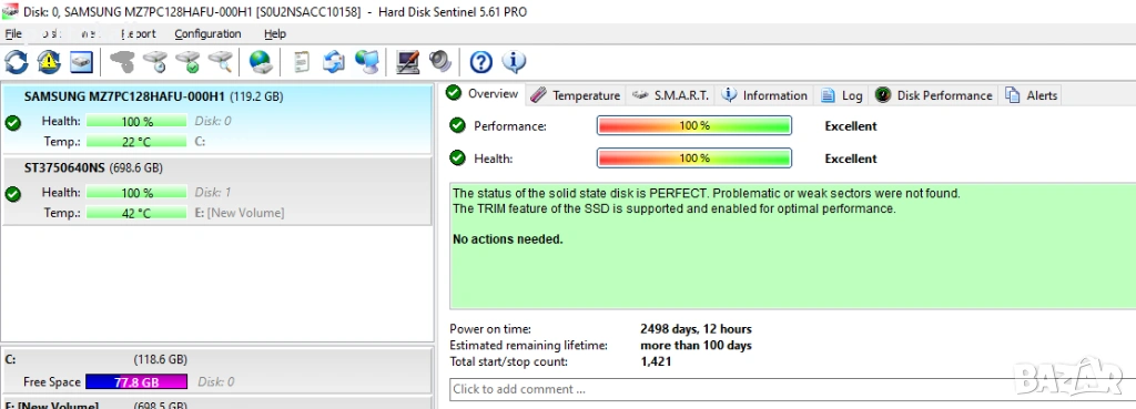 Хард диск: SSD Samsung 128GB + 750GB твърд диск. В перфектно здраве! 100%!