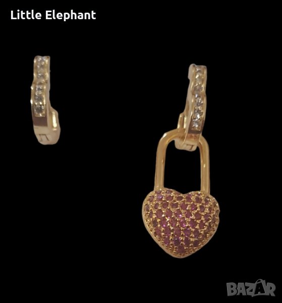 Обеци сърца,Gold с кристали white с висяща част сърце-катинар,dark pink/нови → Обява 44464745