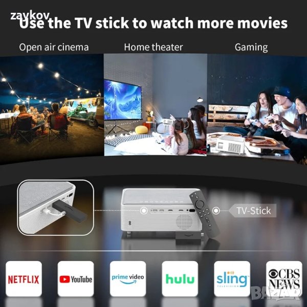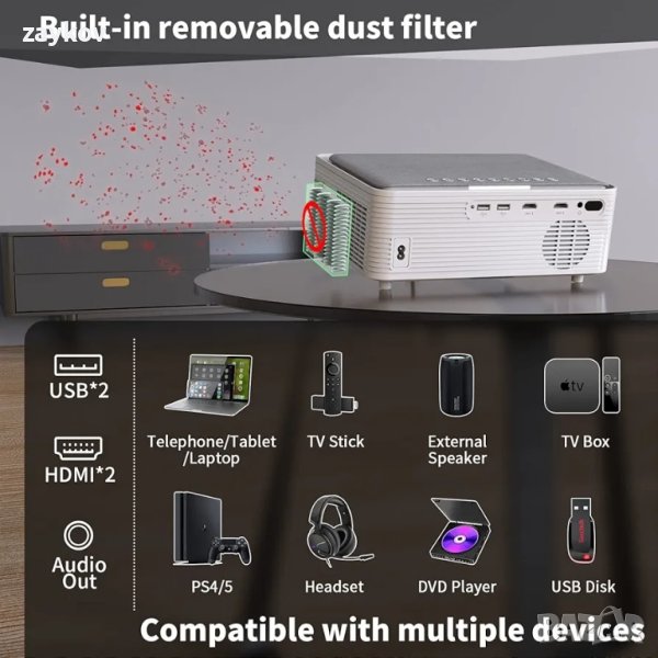 Богати интерфейси за многостранна свързаност: Този филмов проектор има 2 HDMI порта и 2 USB порта и следователно е лесен за свързване към телевизионни кутии и firesticks. Идеален е за домашно кино, футболни игри и дейности на открито. Firesticks могат дори да се захранват директно чрез USB интерфейс. Наличен е Wi-Fi и е съвместим с телефони с iOS и Android. Забележка: Телефоните с Android също могат да използват дублиране на екрана без WiFi връзка.