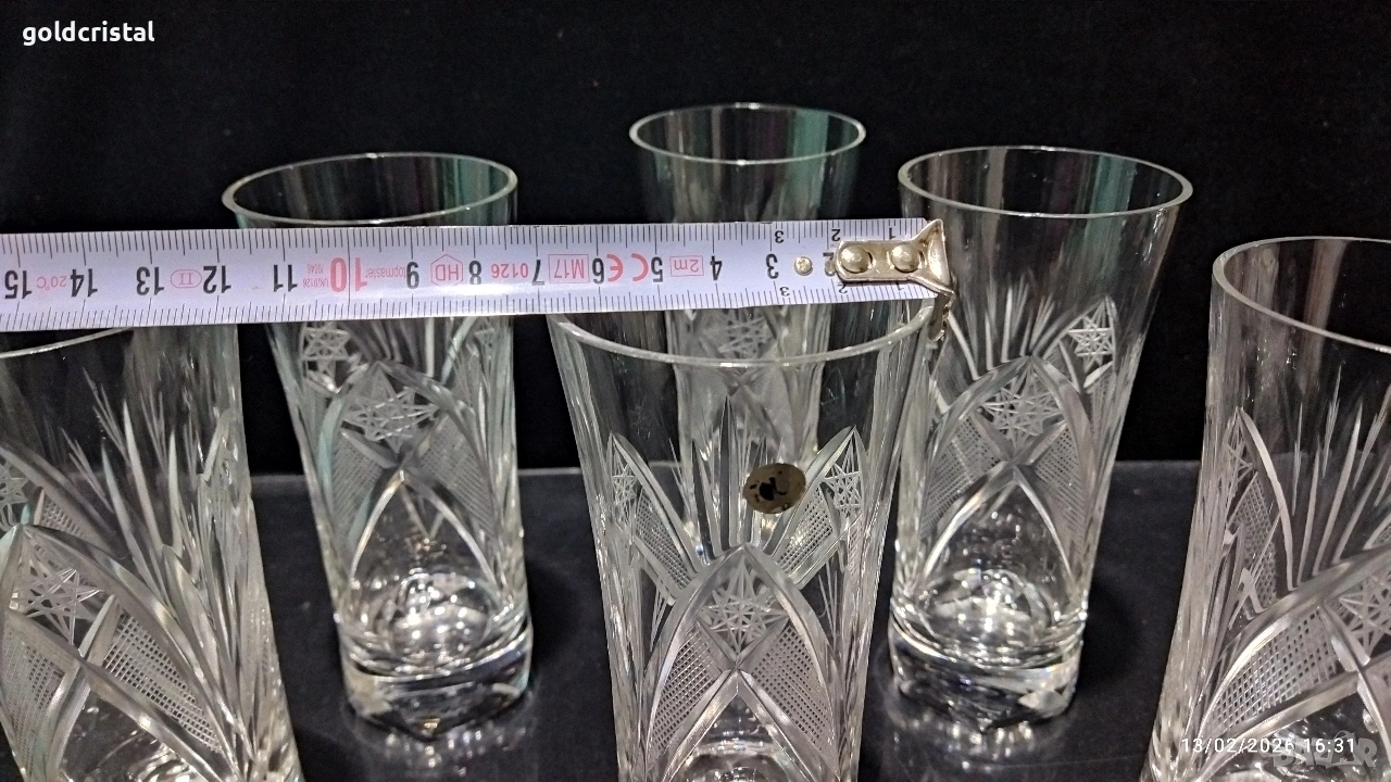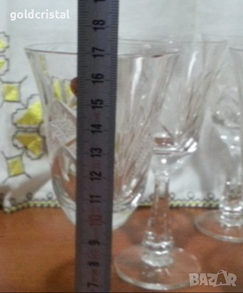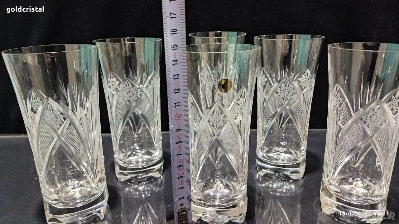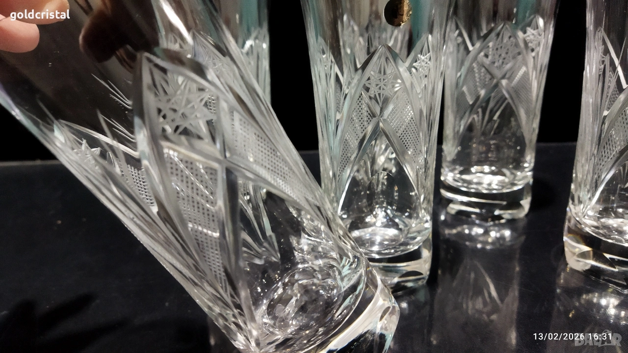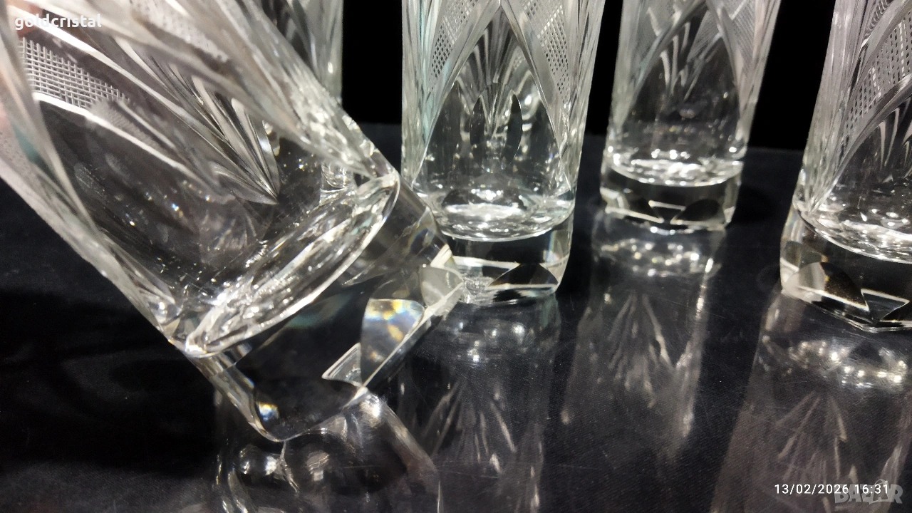Кристални чаши за вода български кристал серия Зорница ръчно гравирани неизползвани сервиз комплект сет лот ретро арт декор винтидж колекция стари антикварни предмети обзавеждане за дома и семейството подходящи за подарък за ценители и колекционери подходящи за подарък за ценители и колекционери