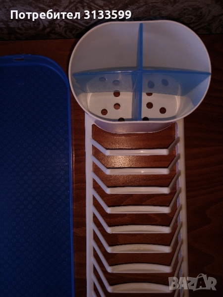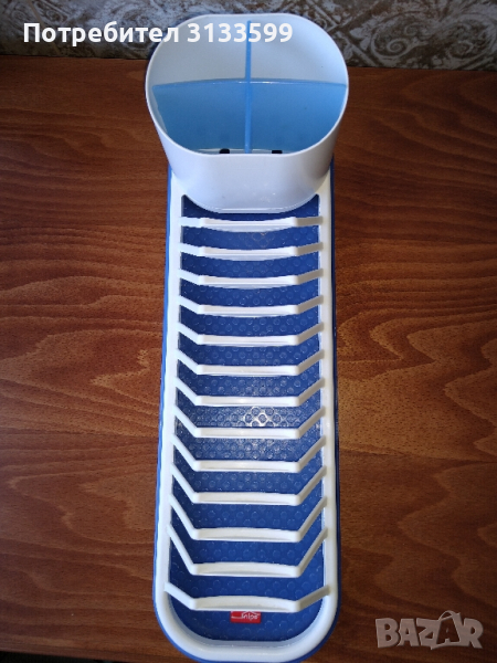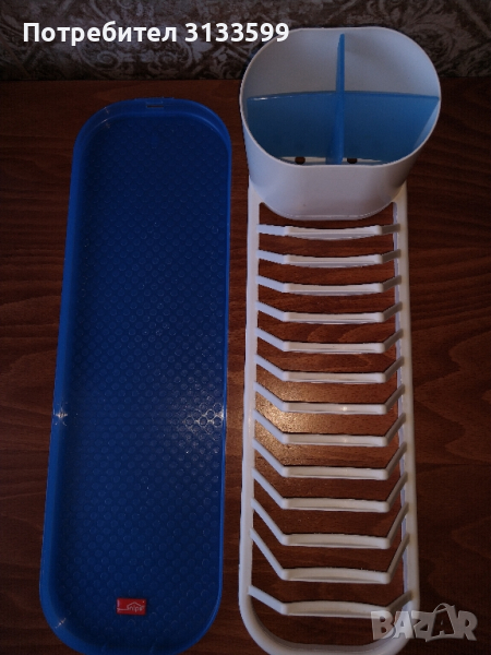 - Малък пластмасов сушилник за чинии и прибори в бяло и синьо. Използван. Дължина: 27,5 см; широчина:12 см; височина: 12 см. Състояние: много добро. ЦЕНА: 12 лв.