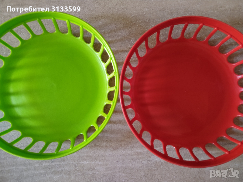 - Две неизползвани пластмасови фруктиери с диаметър 21,5 см и височина 6,5 см. Купувани в Унгария.