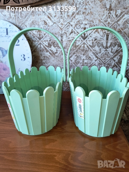 - Два броя нови пластмасови кошници в бледозелено. Размери : дъно 25/13 см; отвор 28/16 см; височина /с вдигната дръжка/ 27 см, без дръжка 14 см.