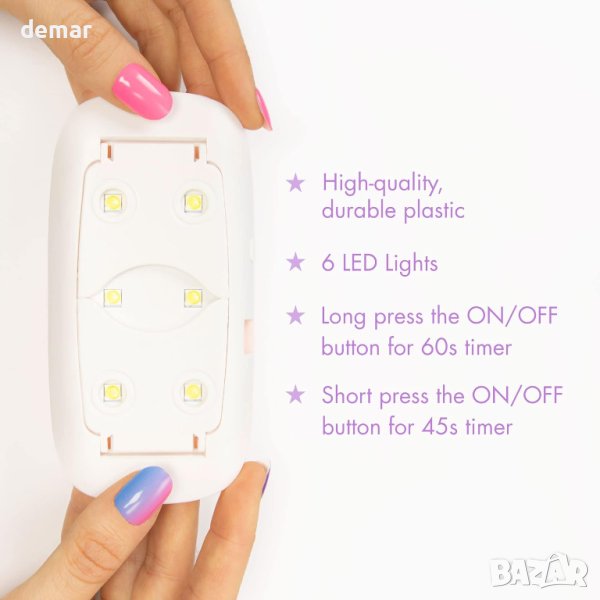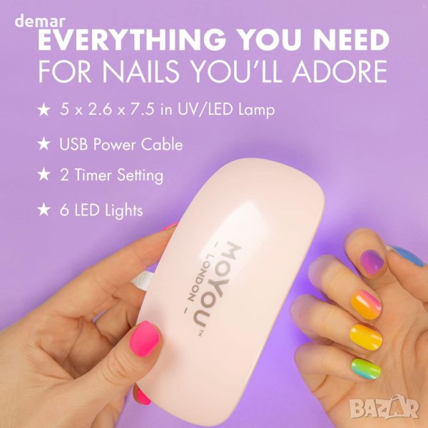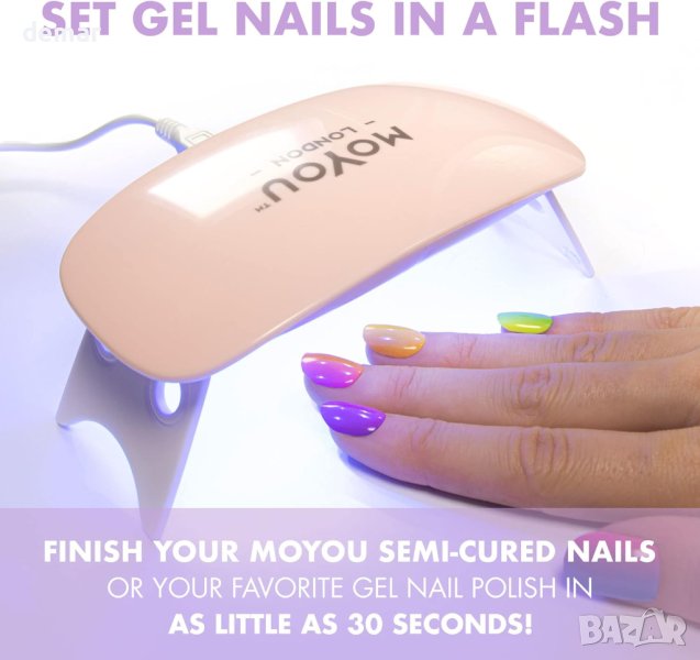 LED и UV лампата за нокти на MoYou London предлага изживяване с качество на салона направо у дома, идеално както за гел лак, така и за полувтвърдени гел ленти, осигурявайки дълготрайни и красиви нокти. Тази лампа за нокти е проектирана с мисъл за преносимостта; той е лек, компактен и изработен от здрава пластмаса, което го прави идеален за пътуване или момичешка вечер. Използва се невероятно лесно: просто поставете пръстите си под лампата и оставете UV или LED светлината да втвърди лака, обикновено за около 30 секунди до 1 минута, в зависимост от настройката. Това прави обмислен и стилен подарък, предлагащ ефективността и резултатите на професионална лампа за нокти, без да е необходимо да посещавате спа център.