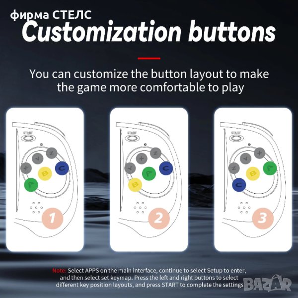 Изберете ПРИЛОЖЕНИЯ, за да влезете в основния интерфейс, изберете Настройки, за да влезете и след това изберете оформлението на бутоните, Натиснете левия и десния бутон, за да изберете различни оформления на бутоните, и натиснете СТАРТ, за да завършите настройката.