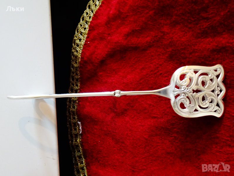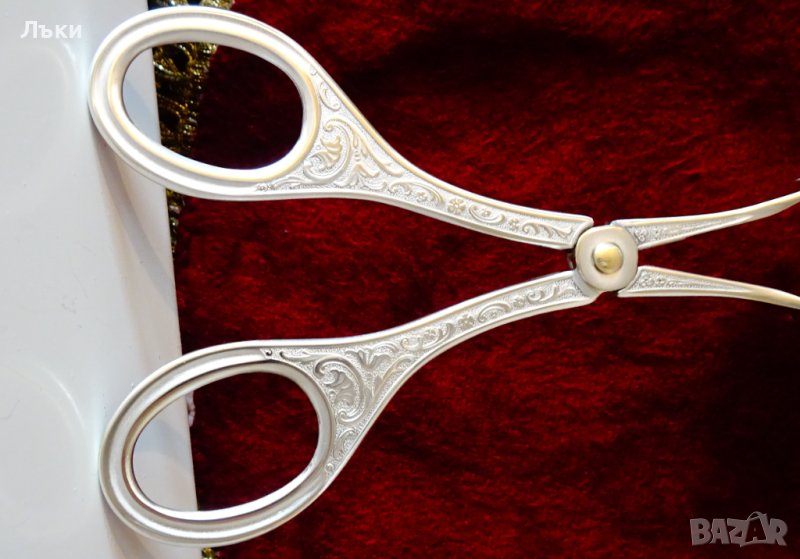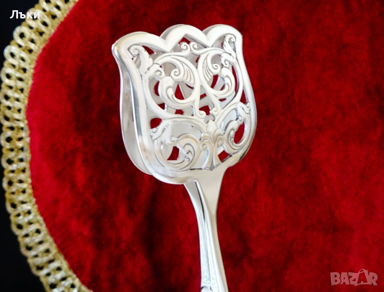 красота,която мога да сравня единствено с тази на бижу.Релефно декорирана с приказни флорални орнаменти и ажур,щипката има дизайн на лале.Перфектно състояние с огледален блясък.Дължина 17 см.,ширина на ръкохватката 6 см.,ширина