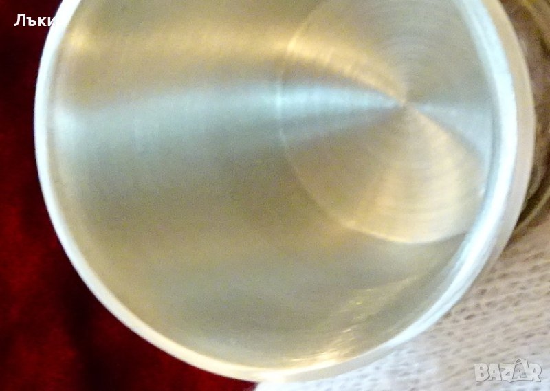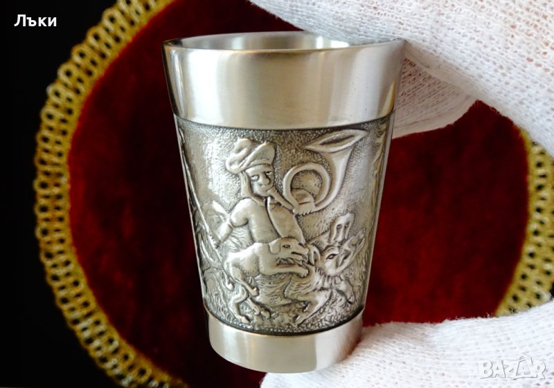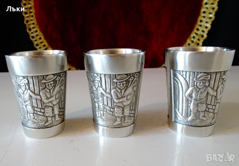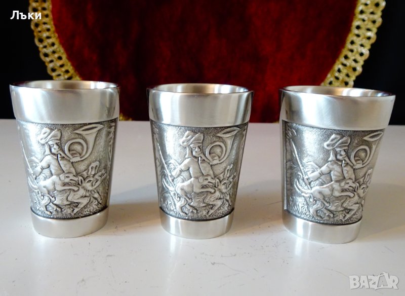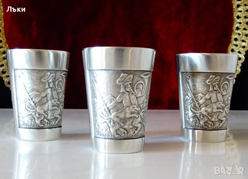 от 95% калай и 5% сребро,маркирани от производителя.Чашите са декорирани с релефна ловна сцена,която показва лов на глиган през средновековието.Височина 5 см.,диаметър 3.5 см.,тегло на всяка 60 гр.Вместимост 50 мл.Перфектни.Налични 3