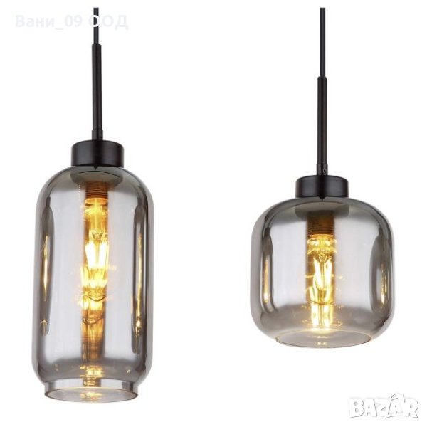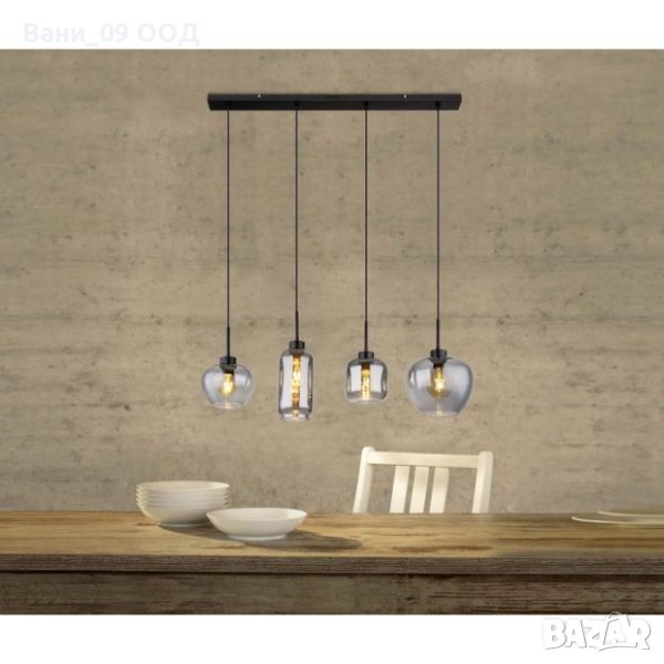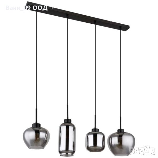 Интересен осветител с привлекателен дизайн, изработен от черен метал и опушено стъкло. Четирите абажура са с индивидуална форма и всеки с различен размер, като се спускат надолу с усещане за дискретна асиметрия. Лампата е проектирана с артистичен почерк и разчупва пространството с нестандартна съвременна визия. Осветителят чудесно се вписва в модерната всекидневна или трапезария.