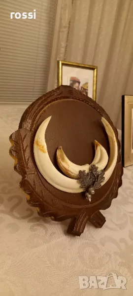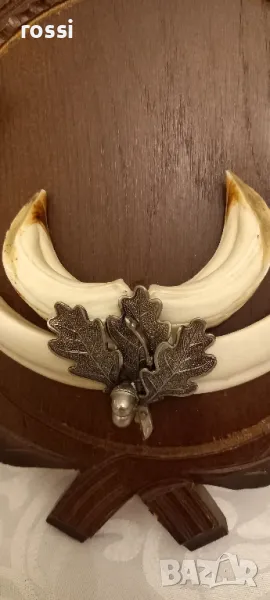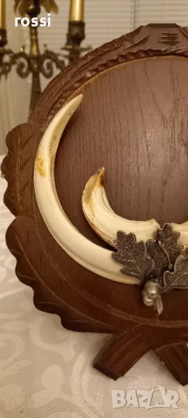 Красив немски трофей диво прасе. Не използван. Резбована трофейна поставка. Документ.