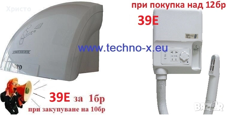 Сешоар за ръце с фотоклетка. Мощен, Икономичен, Стилен, Ергономичен, Евтин, Надежден, Автоматично се задейства при доближаване на ръцете до отвора през който топлия въздух излиза, след отдалечаване /отдръпване/ на ръцете - сешоара се самоизключва. Подходящ за обществени згради, болници, сервизи, големи магазини със сервизни помещения и др. Сешоара е със заоблена форма предотвратяваща поставянето на каквито и да било предмети /включително цигари/ върху него. Сешоара има двойна защита предотвратяваща изгаряния /автоматично изключва при увеличаване на температурата на изходящия въздух над определена стойност/ и др. поражения при запушване на отвора през който излиза топлия въздух.