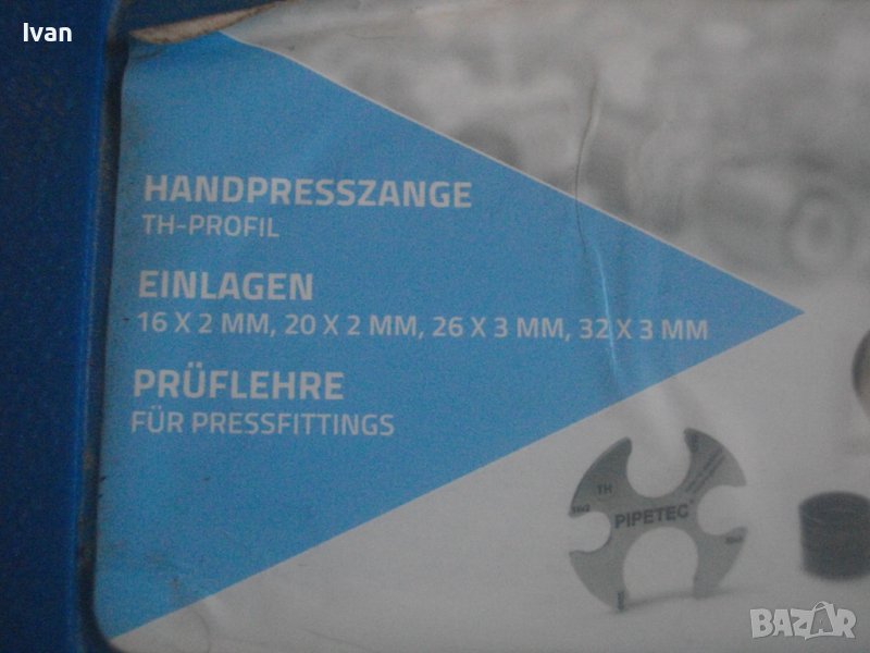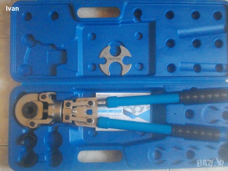 ОПИСАНИЕ на ръчна радиална преса за фитинги до 32 мм при направа на водопроводни инсталации, в син куфар. Цена 229 лв. Съвсем нова, неизползвана и неупотребявана. Универсална до ф32мм. Бързо и сигурно пресоване. Инструментът е ръчна радиална преса за създаване на пресови съединения с пластмасови и комбинирани тръби ф16мм - ф32мм. С телескопични тръбни рамена. Немско професионално производство. Марка и модел Pipetech Handpresszange TH-Profil HPZTH 1632 fur 16 x 2, 20 x 2, 26 x 2, 32 x 2 Pressfittings. Hersteller: Pipetec