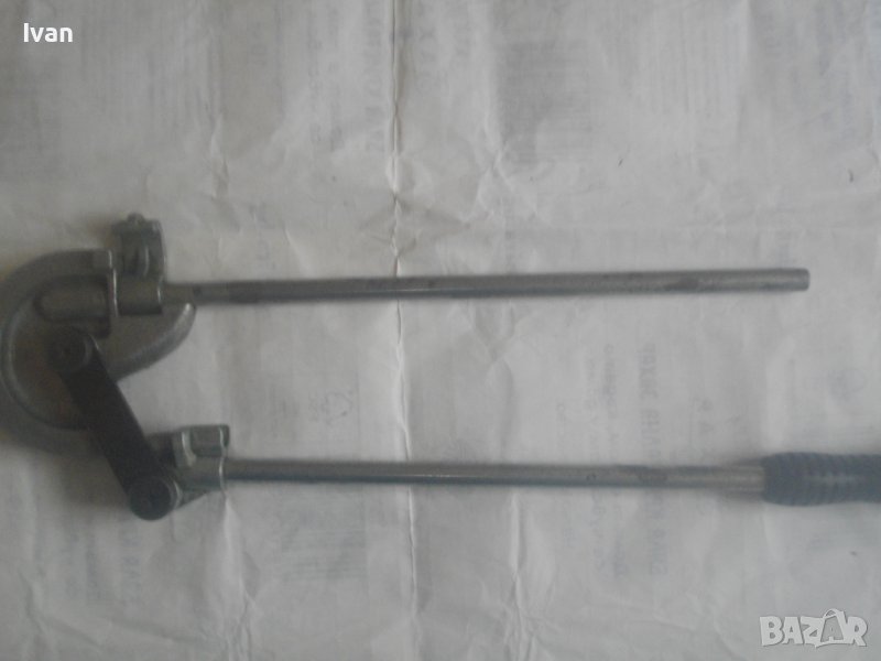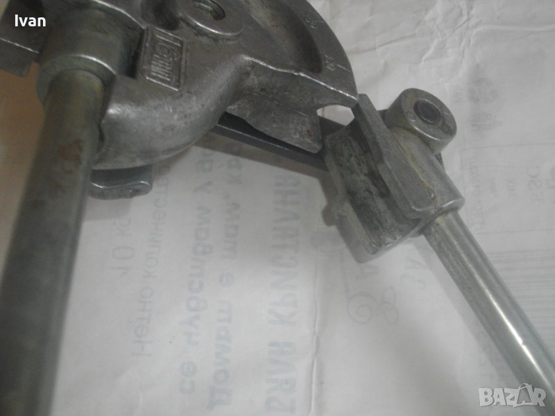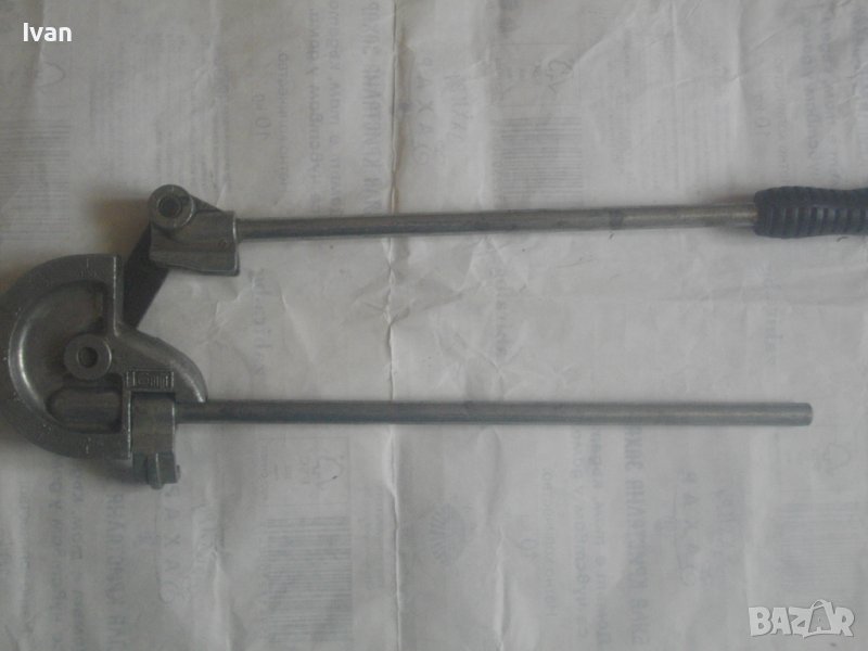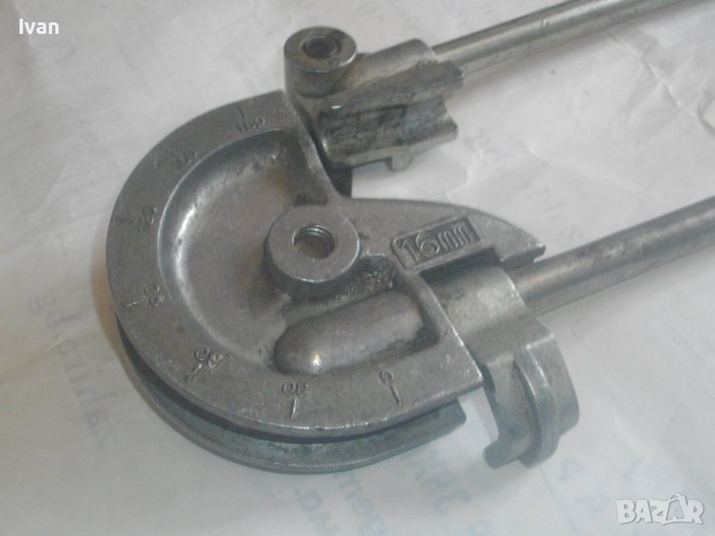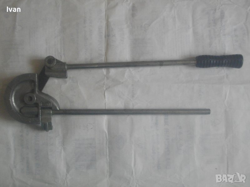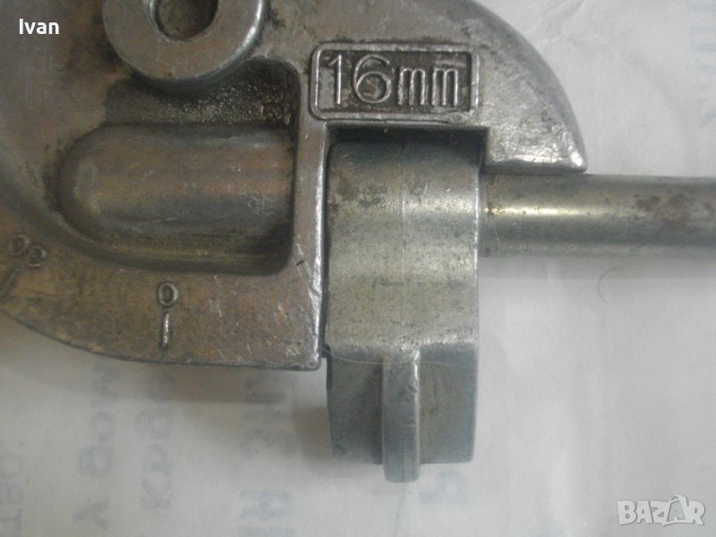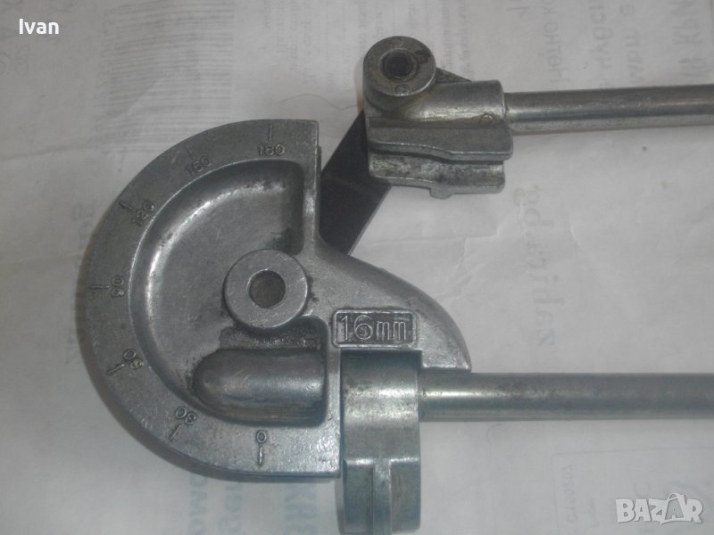 ОПИСАНИЕ на немски тръбогиб 16 мм - уред огъване на меки и полутвърди тръби. Цена 199 лв. Дължина на инструмента 47 см, ширина 13 см, тегло - 1,5 кг. Запазен външен вид, отлично работно състояние. Глава разграфена за 0-180 градуса огъване. Радиус огъване - 50 мм. Немско производство, масивен.