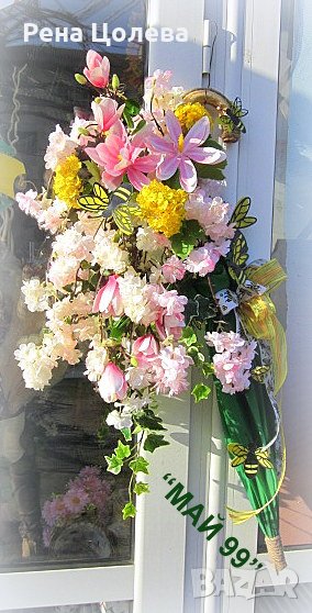Богата,нежна и елегантна аранжировка от изкуствени/цъфнали/,падащи,пролетни клони и магнолии,много зеленина,красива панделка на пчели и различни по големина пчели на дървен чадър с размери 100 дължина и 45 см. в обемната част!