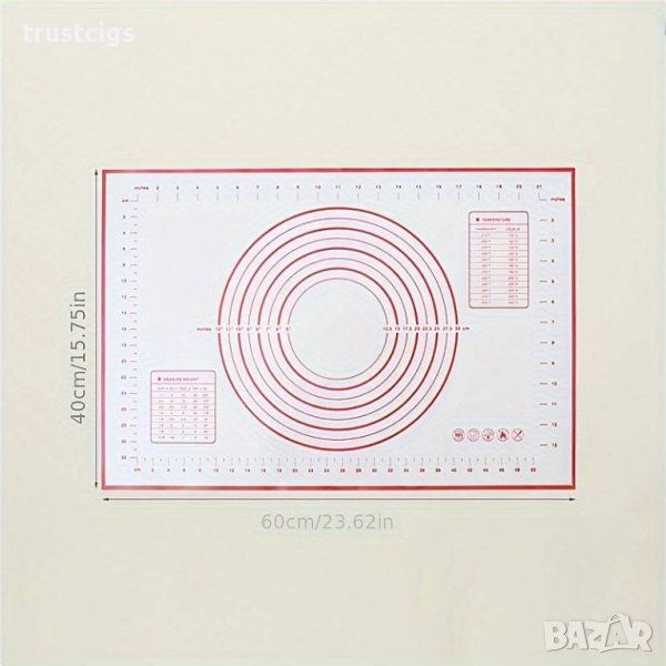 Подложката е разграфена от всички страни, което ви помага да разточите тестото на желаната дебелина. Има и очертани диаметри за улеснение.
