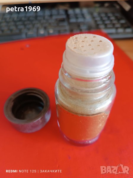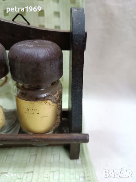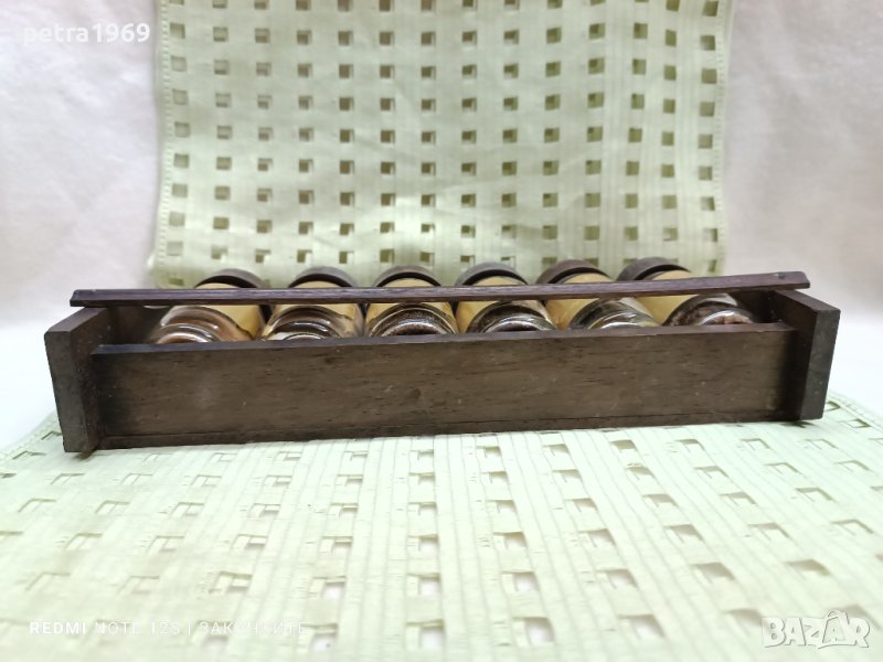 Комплект за подправки - 6 бурканчета с етажерка.Напълно здрави части, без наранявания, без чукнато и пукнато. Етажерката е дървена, с размери 30х6 см. и височина 14 см., има си две приспособления за окачване. Бурканчетата са стъклени, тапите имитират дърво, а под тях има пластмасово капаче с дупки за ръсене. Високи са по 10 см. с капачетата, имат си и етикети, но надписите им са заминали. Те са си СЪС подправките, при заявявяване ще ги изпразня и измия. Цена за комплекта 30 лв.