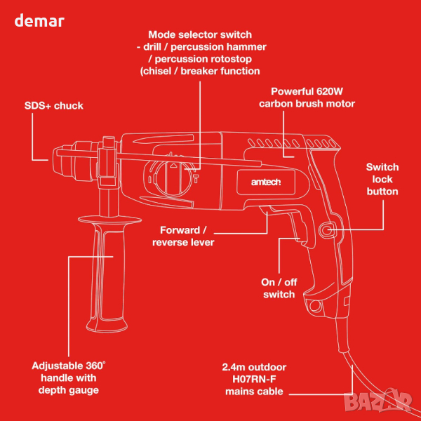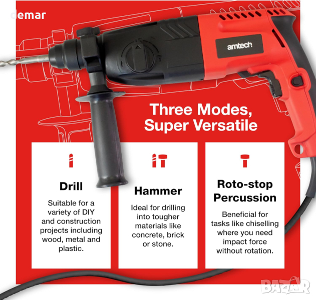Amtech Ударна бормашина, с кабел 2,4 м, 3 режима,(230V, 620W, 1250RPM)