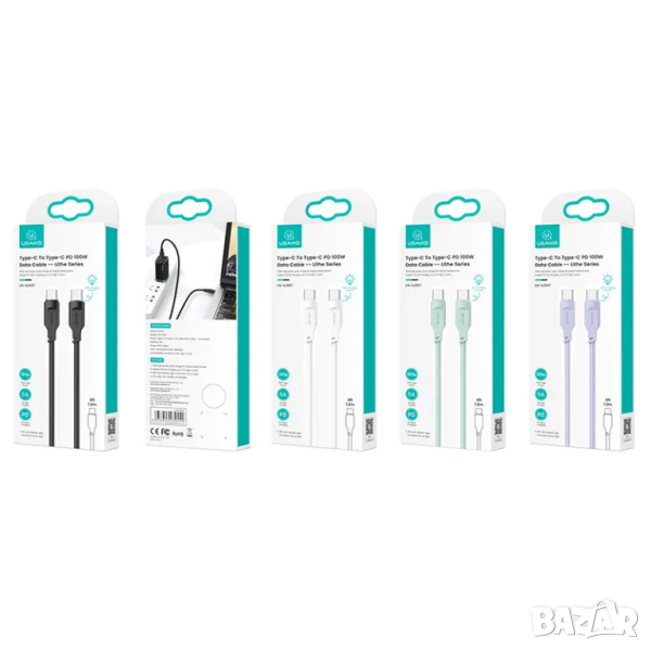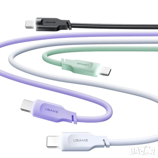 Кабел USB-C към USB-C на USAMS (модел US-SJ567), дължина 1.2 метра, капацитет до 100 W PD (Power Delivery), с LED индикатор, лилав цвят. Подходящ както за бързо зареждане на смартфони и таблети, така и за захранване на лаптопи и устройства, които изискват по-голяма мощност.
