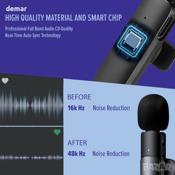 Безжични микрофони ASILEX, революционизиращи аудиозаписа с ориентиран към клиента дизайн. С безпроблемна функция plug-and-play, този петличен микрофон се синхронизира без усилие с IOS устройства, елиминирайки необходимостта от допълнителни приложения или добавки. Създателите на съдържание в социалните медии се радват! Насладете се на подобрено качество на звука с подкаст микрофона ASILEX, включващ 2.4G чип за намаляване на шума с изключително ниско забавяне, осигуряващ кристално чист звук дори в шумна среда. Перфектен за влогове, интервюта, стрийминг на живо и др. Специално проектиран за iPhone, този