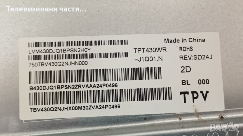 Philips 43PUS8007/12 със счупен екран.Панел TPT430WR-J1Q01.N REV:SD2AJ
