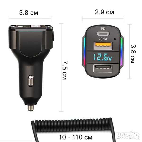 Адаптер за запалка с 3 порта, кабел и волтметър автомобил джип миниван кола