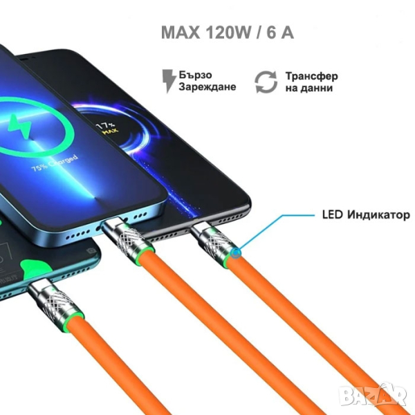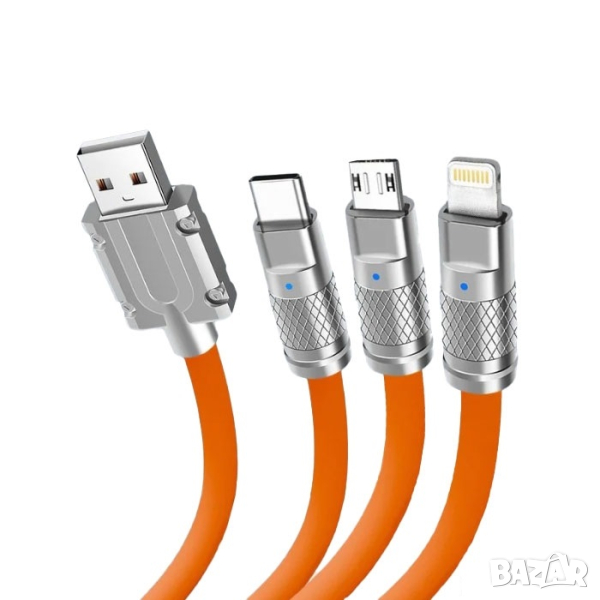 Кабелът за зареждане има 3 различни типа конектори за различни устройства с конектори Lightning, Micro USB, Type C.