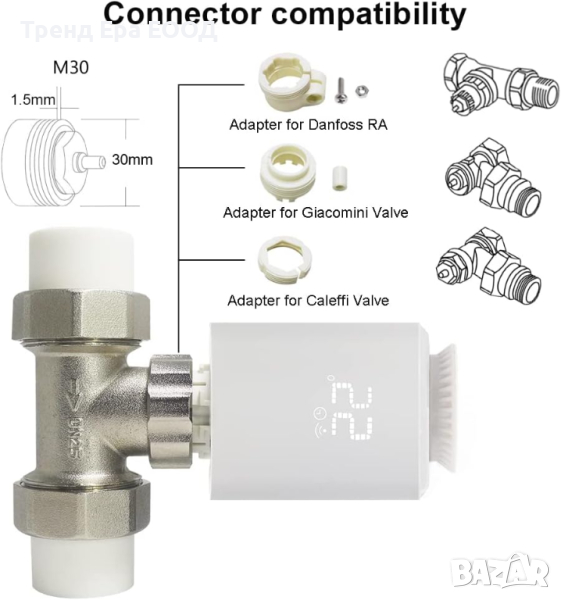 Гъвкаво управление. Задайте температура на самия термостат на радиатора или чрез приложението и чрез гласова команда. Приложението Smart Life/Tuya ви позволява да управлявате дистанционно вашия zigbee радиаторен термостатен вентил стая по стая или да създадете група, за да ги управлявате заедно. Използвайте гласови команди, за да промените температурата в отделни стаи или групи от стаи. Напълно съвместим с Alexa, Google Assistant. Автоматичен режим или ръчен режим. Изберете автоматичен режим или ръчен режим, за да отговарят на вашите индивидуални нужди, като същевременно спестявате енергия и разходи от сметката си за енергия. Автоматичният режим има четири програми за времеви периоди за всеки ден от седмицата, което ви дава свободата да програмирате ежедневните си графици независимо, така че настройките ви за комфорт наистина да отговарят на вашето време. Икономия на енергия. Затопляйте дома си до правилната температура само когато е необходимо с графика за отопление, за да спестите енергия и разходи от сметката си за енергия. Разпознаването на отворен прозорец ви позволява да проветрявате дома си още по-лесно, интелигентният trve zigbee ще спре отоплението автоматично, когато прозорците или вратите са отворени, за да предотврати загубата на енергия. Висока производителност. Този термостатичен радиаторен вентил TRV zigbee работи с всички вентили с размери на резбата M30 x 1,5 mm и се предлага с трите адаптера за вентил Danfoss RA, клапан Caleffi и клапан Giacomini. Повече функции включват предупреждение за изтощена батерия, калибриране на температурата; заключване за деца; защита от замръзване и варовик и др.