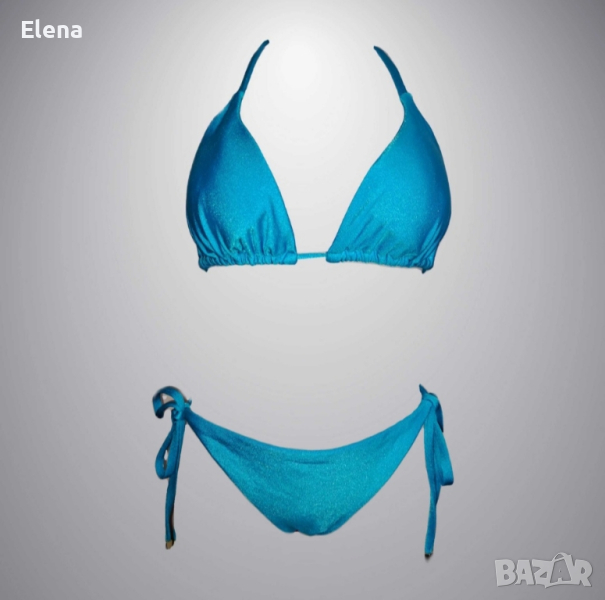 Бански костюм от 2 части Santorini Blue в син цвят,произведен от висококачестен италиански плат.- Триъгълна горна част с меки подвижни подплънки и връзки за стилизиране около врата и талията- Долнището е изрязана бикина с набран шев по средата- Състав: 85% полиамид 15 % еластан- Висококачествен италиански плат- Бързосъхнеща материя- Висококачествени позлатени аксесоари с антикорозионни свойстваМоля, перете този артикул на ръка с топла вода и сапун!Не сушете в сушилня, а само на въздух!- Размери: S,M,LПроизведено в България!Бранд: EleniSwim.Цена на скрънчи от същия десен: 3.50 eur.Последвайте ни във Facebook: EleniSwim и Instagram: eleniswimwear