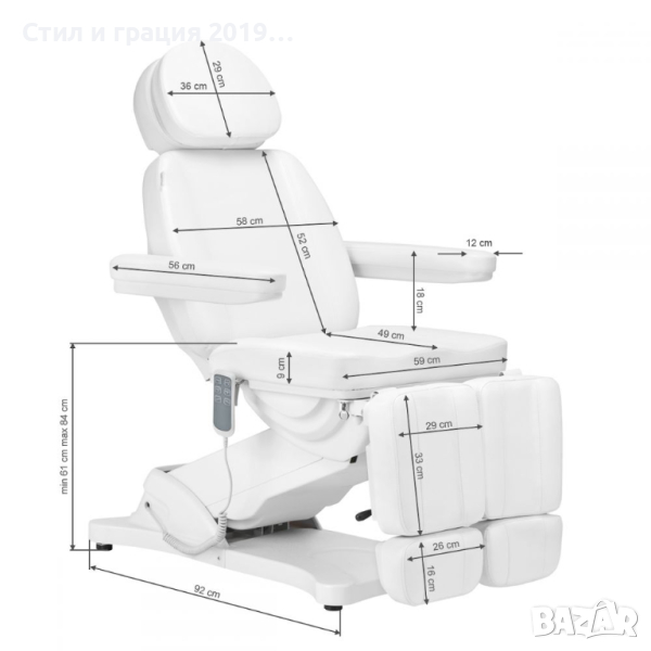 С помощта на лесно за използване дистанционно управление столът се регулира плавно в три равнини - регулира се по височина, облегалка и наклон на люлката. Седалката може да се регулира на височина от 61 см до 84 см , а в напълно разгънато състояние столът достига дължина от 2 м . Тези размери позволяват лесното използване на оборудването от хора с различен ръст и позволяват адаптирането му към извършваната в момента процедура и индивидуалните нужди, което се отразява на комфорта както на потребителя, така и на лицето, извършващо услугата. Дръжките от двете страни на седалката ви позволяват да закачите дистанционното, така че да ви е винаги под ръка.