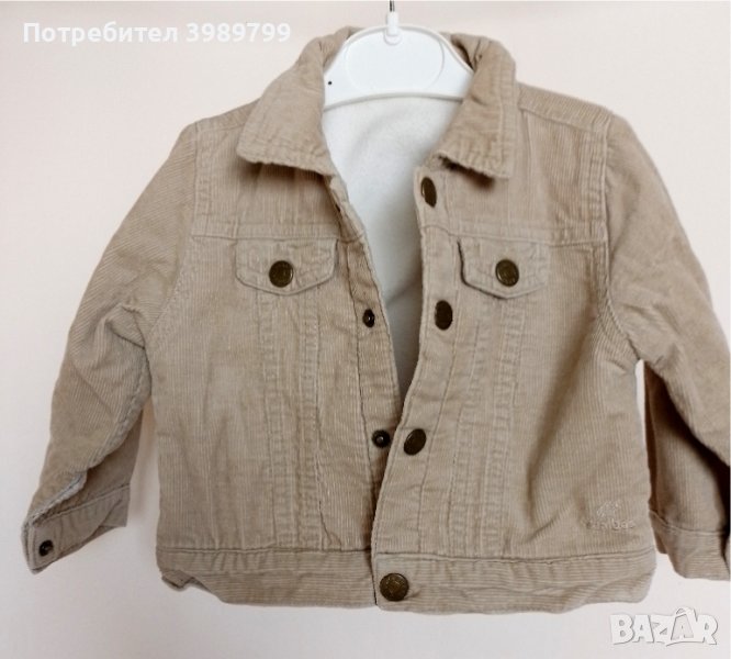 Топли дрешки за момче/момиче, запазени. Не са оригинален комплект, но биха могли да се съчетаят: черни ватирани джинси и бежово ватирано джинсово яке, 9-12м; Цена 10лв общо.