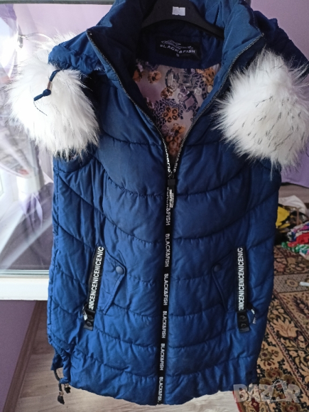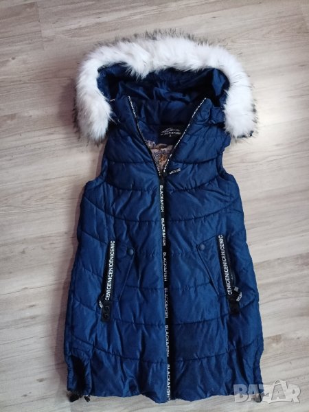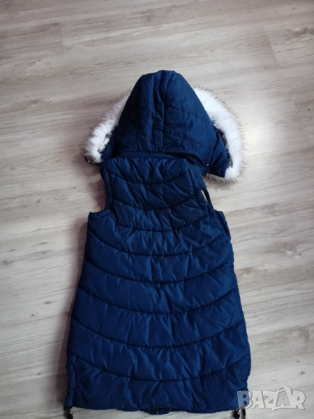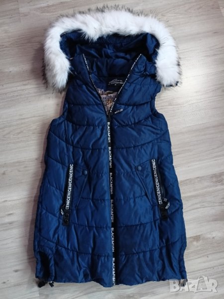 тъмно син шушляков елек,размер S,странични джобове, качулка със свалящ се пух.Елека е носен много малко,без забележки е.