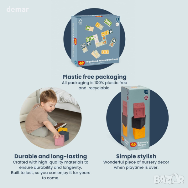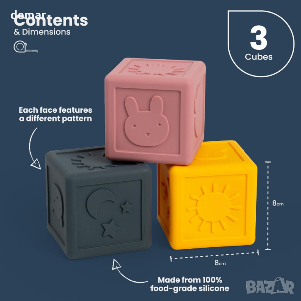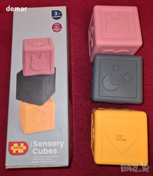 Силиконовите сензорни кубчета са комплект от три меки, тактилни блокчета, предназначени да стимулират сетивата на бебета и малки деца. Всеки куб показва уникален модел и цвят, приканвайки малките да ги изследват и да се занимават с тях. Тези сензорни блокчета служат и като играчка за подреждане, подпомагайки развитието на фините двигателни умения, координацията око-ръка и контрола на хващането. Подходящи за деца на възраст над 3 месеца, тези кубчета са отличен подарък за първи рожден ден, Коледа или като обмислен подарък за малки деца. Изработени от 100% хранителен силикон, тези играчки са безопасни, устойчиви и отговарят на стандартите за безопасност на играчките EN71, като използват само нетоксични бои и лакове. Bigjigs Toys, с история, датираща от 1985 г., продължава да се ангажира да предоставя висококачествени, безопасни и образователни играчки, които подпомагат развитието на децата чрез игра, открития и учене.