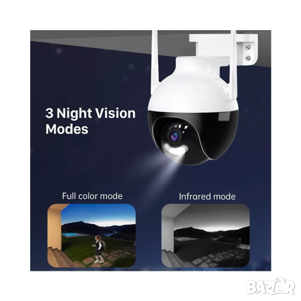 5X увеличение за наблюдение с автоматично следене на движението, цветно нощно виждане и двупосочна аудио връзка с управление от всеки телефон (Android, Apple) или компютър. С нова подобрена матрица. Камерата разполага с изкуствен интелект, който автоматично засича човешката форма и моментално изпраща известие на смартфона Ви. Снабдена е с мотор и се завърта във всички посоки. Управлението става директно, чрез смартфона - отдалечено. Камерата изпраща нотификации при засичане на движение и звук, директно на смартфона, чрез приложението, с което работи. PTZ управление: 270-градусово хоризонтално завъртане и 85-градусово вертикално, като по този начин обхваща по-голям периметър. Отлично качество на картината с 6mpx бленда.