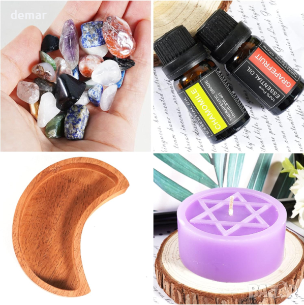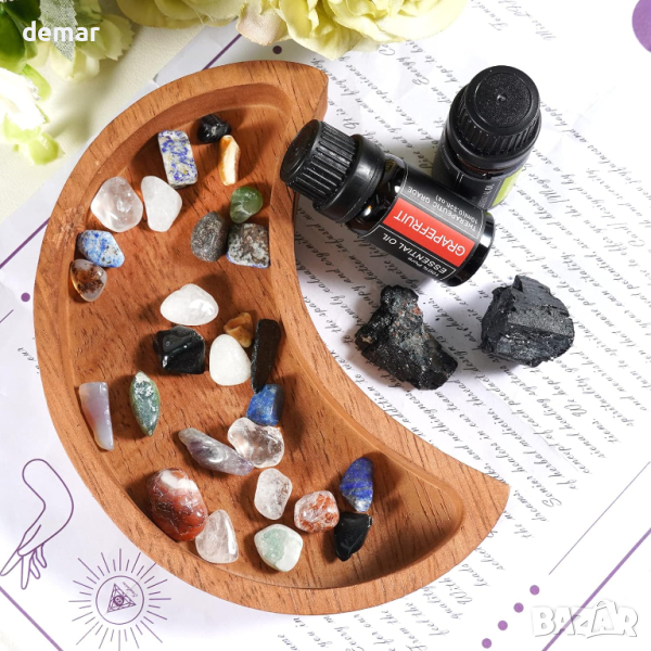 Този лунен поднос/чиния, включващ перфектни лунни резби, е нов и привличащ вниманието кристален поднос, който се удвоява като декоративен и функционален елемент за показване на камъни, бижута и дрънкулки или сервиране на мезета. Изработен от черен турмалин, известен със своите мощни лечебни и защитни свойства, той е идеален за тези, които се интересуват от гадаене, медитация или просто като стилен домашен акцент. Придружаващият комплект етерични масла за ароматерапия, с успокояващи масла от