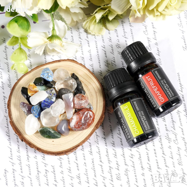 Soulnioi Декоративен поднос с черни обсидианови камъни, 2 ароматерапевтично масло лайка + грейпфрут