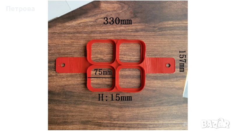 Размери: Диаметър на ринга: 15,7 см. За 4 палачинки с формата на квадратчета. Подходящ за тиган с диаметър 24 см и повече. Дръжки за обръщане на палачинките.