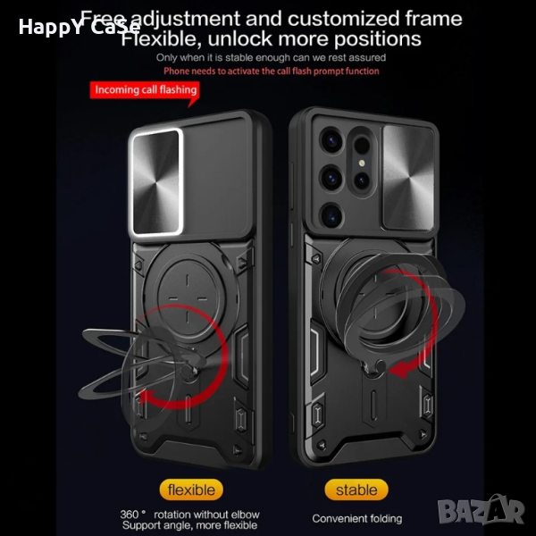 4. Голям метален пръстен отзад на гърба. Служи като стойка на която телефона може да се обляга в хоризонтално и вертикално положение. Също пръстена може да се използва и като finger holder за сигурно захващане на телефона с един пръст. За по-голямо удобство, пръстена може да се завърта на 360 градуса.