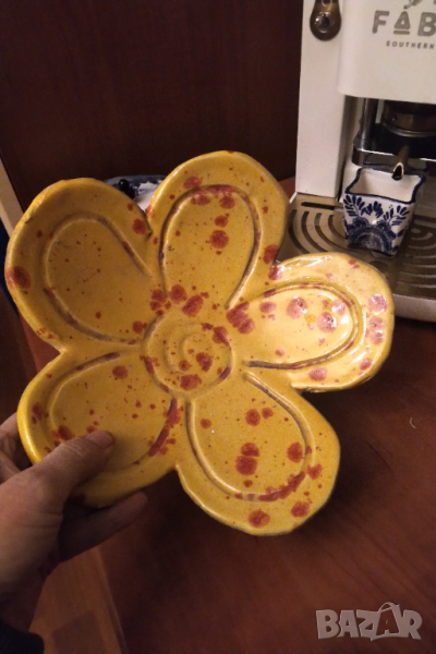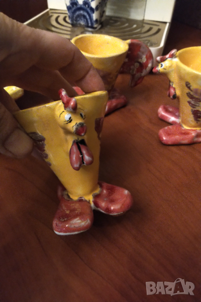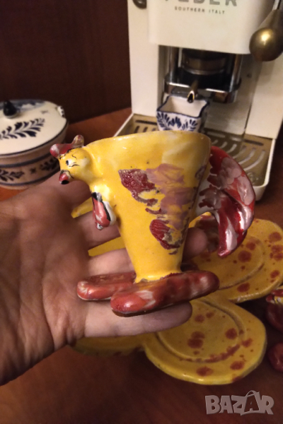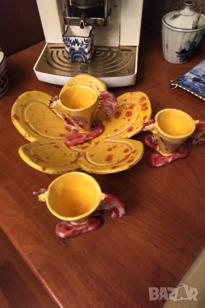 УНИКАЛЕН Гланцирана керамика изцяло ръчна изработка правен по поръчка ,Чашките са във форма на петлета 5 на брой вместимост 50 мл.Чинията във форма на цвете е за дребни сладки или каквото решите ,вис 6 см диаметър 25 см .Колекционерски не ползван .КРАЙНА ЦЕНА