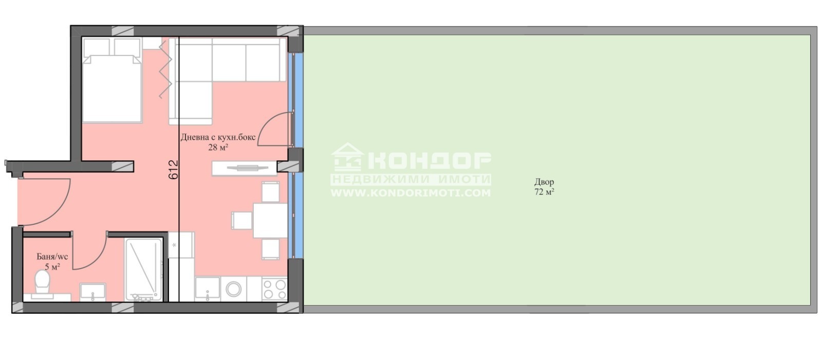 Разпределения - Просторни и много функционални апартаменти с просторни стаи и гледка към Стара планина, а също и с партерни жилища с двор и такива с големи панорамни тераси. Апартаментът, който Ви предлагаме е с изцяло източно изложение и се състои от едно просторно помещение с реална възможност да бъде отделена спалня, баня с тоалетна и собствен двор 72кв.м.