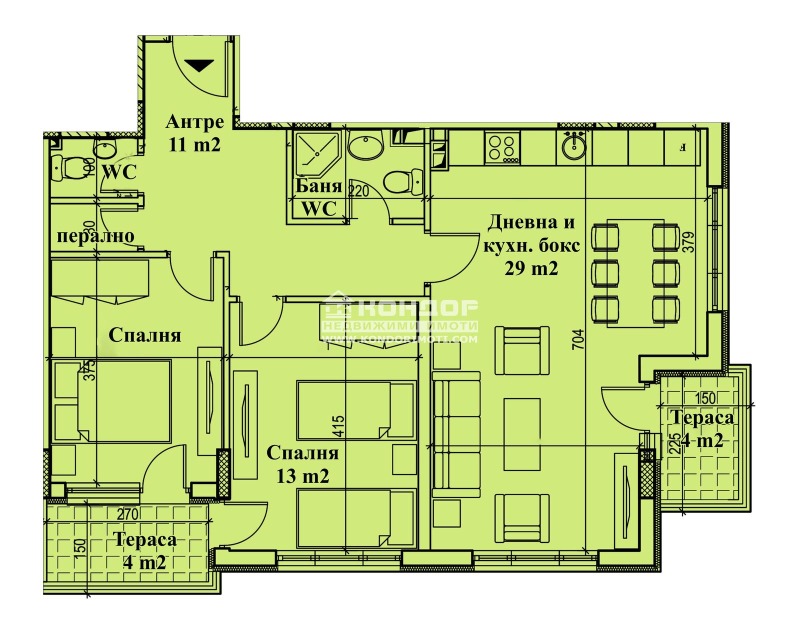 Оферта 56165: Предлагаме ви възможността да закупите просторни и светли апартаменти, намиращи се в сграда със съвременна архитектура с иновативна визия, съчетаваща модерни технологии с качествени материали на строителство, позиционирана в самото сърце на квартал Кършияка!!! Апартаментите са с отлично разпределение !!! Жилището което ви предлагаме е с изложение ЮГ/ИЗТОК и се състои от дневна с трапезария и кухненски бокс 29м2, две самостоятелни спални, две санитарни помещения,перално, входно антре и две тераси. Сградата се строи от реномирана фирма с множество готови сгради в града, като можем да ви покажем качеството на изпълнение и материалите които се използват. Жилищата се отвършват според всички изисквания за качествено строителство, хидравличен асансьор, блиндирани входни врати, висок клас ПВЦ - дограма. Свободни Паркоместа и Гаражи на партерно ниво. Разсрочено плащане в рамките на строителството. СТРАХОТНА ИНВЕСТИЦИЯ!