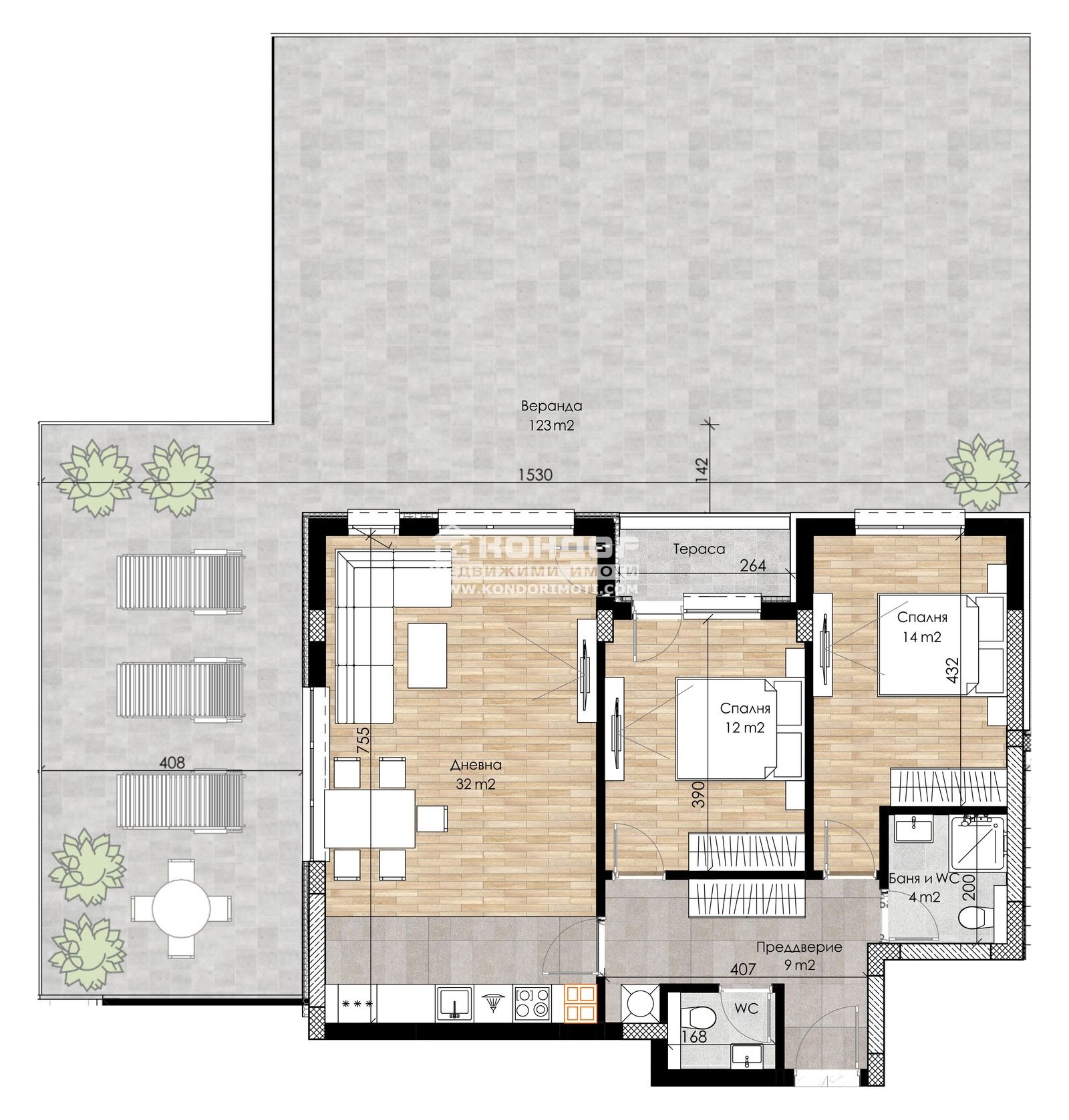 Оферта 59341: АКТ 16!!! Представяме на Вашето внимание комплекс от затворен тип в град Пловдив. Вече 15 години компанията акцентира върху комфорта, безопасността и сигурността в своите комплекси, естетичното оформление на пространството около сградите и отлично развитата инфраструктура, сред която умело да бъдат съчетавани работа, развлечения, спорт и почивка. Апартаментът, които ви предлагаме се състои от просторна дневна - 32 кв.м., две спални по 12 и 14 кв.м., баня с тоалетна, втора тоалетна с мивка, широко входно антре с място за перално, една тераса и голяма веранда123 кв.м. Най-новият проект на компанията е луксозен комплекс, който е разположен в южната част на град Пловдив, обграден от природа, която дава неподправено усещане за простор и спокойствие, с невероятна гледка към Родопите. Комплексът се базира на концепцията за извънградски комплекс, където в голям терен се разполагат по-малки жилищни единици, къщи и апартаменти, които предлагат спокойствието в покрайнините на града. В сградите има жилища с една и две спални, единични и двойни подземни и надземни гаражи, както и външни паркоместа. На входа на всяка сграда е поставена система за индивидуален чип, високоскоростни асансьори, а вътрешнопарковото пространство е решено в богата висока и ниска растителност, заобиколена от живописни зеленина, детска площадка и площ за спорт. Благодарение на ниската си плътност на застрояване, архитектурния си дизайн и добрата ориентация, комплексът е предпочитано място, което осигурява на обитателите си спокоен и качествен живот. Осигурено Банково Финансиране с изключително Изгодни условия за клиенти на Агенцията от Водещи Банки !!!